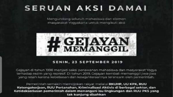 Poster seruan aksi damai Gejayan Memanggil yang beredar luas di media sosial. Aksi damai ini digelar Sening (23/9/2019) siang ini. (Foto: Istimewa)