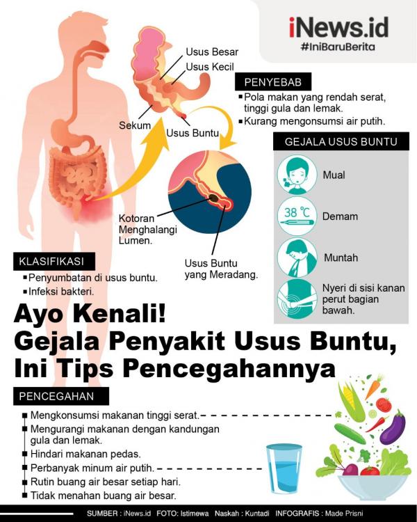 “Penyakit ini paling sering karena penyumbatan pada usus buntu karena penumpukan feses/kotoran yang menyebabkan iritasi hingga menjadi peradangan di usus buntu,” kata Nitismara, Selasa (10/11/2020).