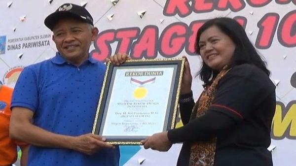 Pemecahan rekor itu dilakukan di pelataran Candi Banyunibo, Sleman, DIY, Minggu (7/10/2018). Butuh 100 pelajar untuk membentangkan kain tenun stagen sepanjang 1.001 meter tersebut.