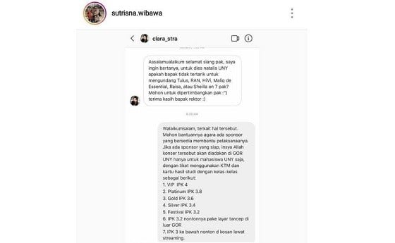 Awalnya, seorang mahasiswi UNY dengan nama akun Instagram (IG) Clara_stra menulis direct message (DM) ke rektor, Rabu (27/3/2019). Dalam pesannya, dia memberi ide jika pelaksanaan dies natalis turut mengundang sejumlah band dan musisi ternama. Dia pun meminta pertimbangan dari sang rektor.