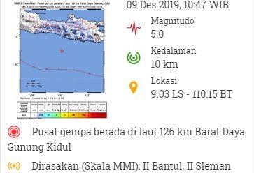 “Gempa Mag:5.0, 09-Des-19 10:47:26 WIB, Lok:9.03 LS, 110.15 BT (Pusat gempa berada di laut 126 km Barat Daya Gunung Kidul), Kedlmn:10 Km Dirasakan (MMI) II Bantul, II Sleman,” tulis @infoBMKG, akun Twitter resmi BMKG, Senin (9/12/2019).