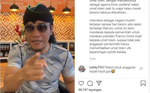 “Sampai saat ini saya melihat belum ada reaksi apa pun dari pemerintah Indonesia. Maka pada kesempatan ini, saya Gus Miftah orang yang memilih pemerintah memohon kepada pemerintah untuk memberi peringatan kepada Presiden Prancis untuk menegur dan menekannya supaya minta maaf kepada umat Islam di dunia karena kami merasa sakit hati nabi kami (Muhammad SAW) dihina,” kata Gus Miftah dalam unggahannya di akun Instagram @gusmiftah, Selasa (27/10/2020).