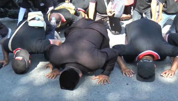Katir Triatmojo dan pendukungnya sujud syukur begitu tiba di rumahnya setelah berjalan kaki sejauh 11 km dari Gedung DPRRD DIY. (Foto: iNews.id/Trisna Purwoko)