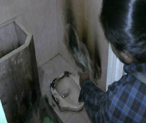 Di dalam kamar mandi Masjid Al Iman inilah puluhan Alquran dibakar seorang perempuan yang diduga mengidap gangguan jiwa. (Foto: iNews.id/Budi Utomo)