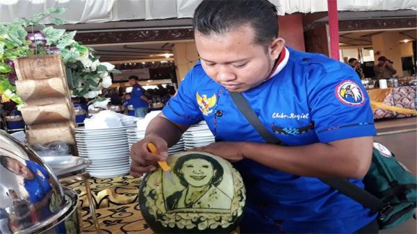 Karena itu, sejumlah anggota JCF mempersiapkan diri dengan membuat aneka jenis biota laut yang terbuat dari pepaya, wortel, labu, singkong dan juga semangka, serta melon. Hasilnya bisa dibuat beberapa jenis ikan, kepiting dang juga foto Menteri Susi Pudjiastuti di kulit semangka. “Butuh waktu satu setengah jam untuk membuat siluet Bu Susi,” kata Koki di Melia Purosani Hotel Yogyakarta ini.